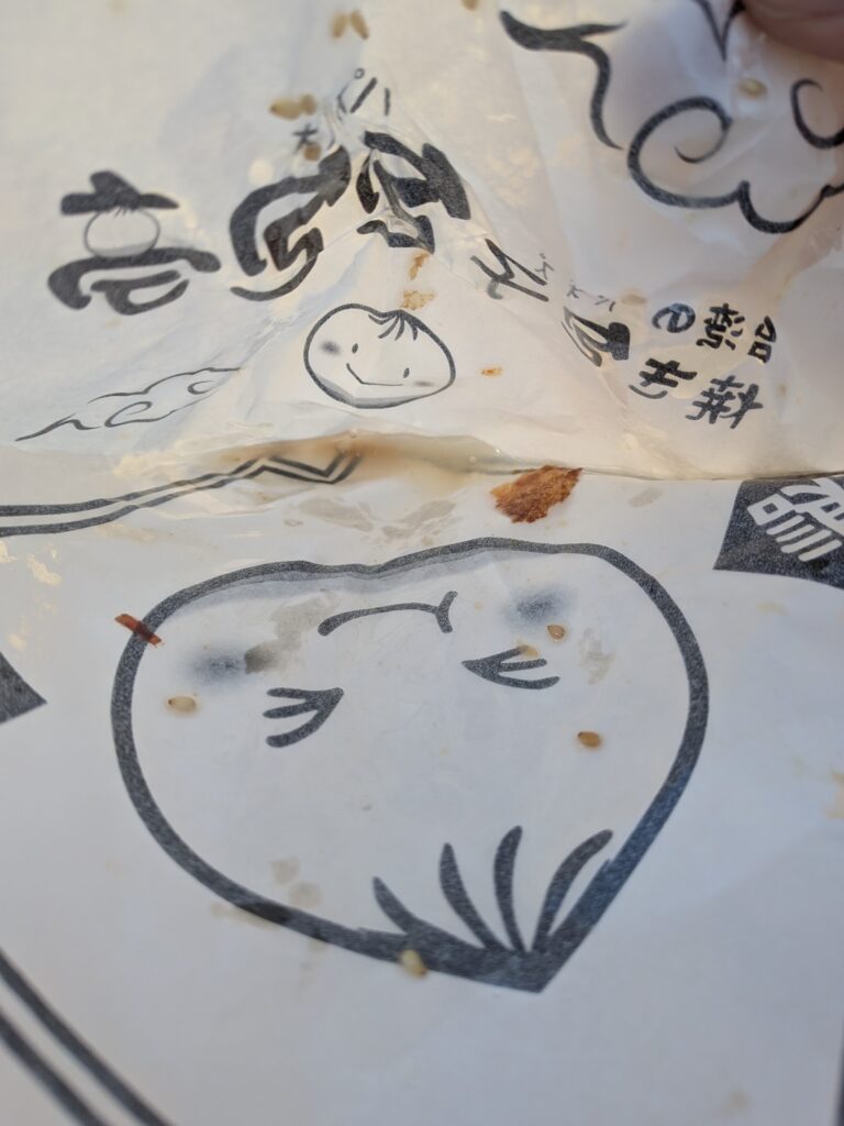 さて、ここからが本題です。 肉包(ロウパオ)を買うと、店頭の看板や店員さんから「肉汁が飛び出すので注意してください!」と警告されます。
